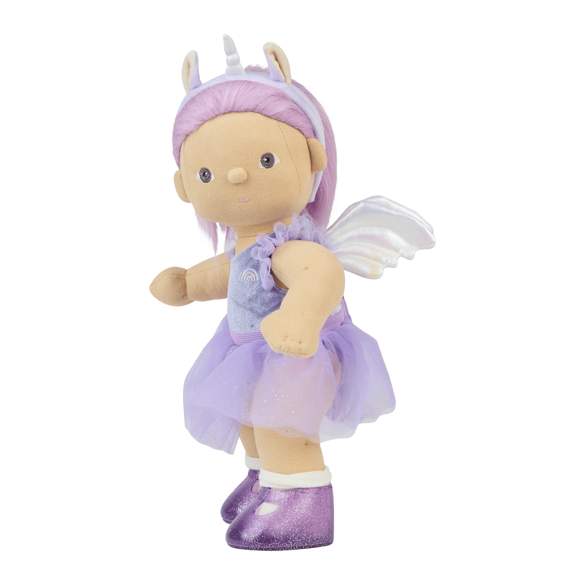 La muñeca Dream Dinkum Violet da vida al mundo mágico y los sueños de los más pequeños . Confeccionada con tela suave y un atuendo diseñado con detalles brillantes, Violet siempre está lista para aventuras llenas de maravillas. Vestida con un leotardo de terciopelo con un tutú de tul brillante, alas de felpa iridiscentes y una diadema de unicornio brillante, Violet está hecha tanto para vuelos de fantasía como para dulces abrazos.