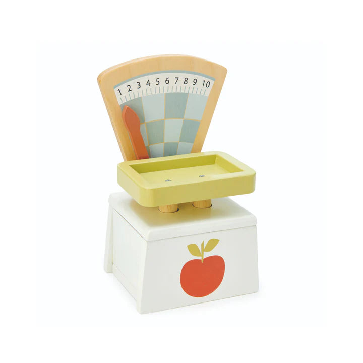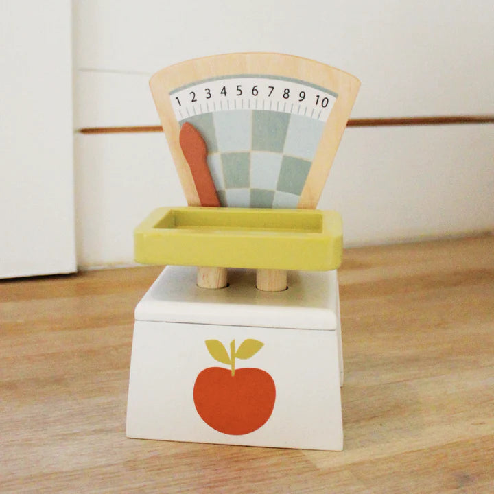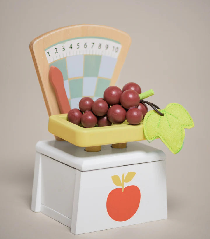 Esta báscula es el accesorio perfecto para jugar a las compras del supermercado mientras te diviertes pesando tus alimentos. Al colocar las frutas y verduras en la bandeja podrás observar como se mueve la palanca de madera hacia la derecha.