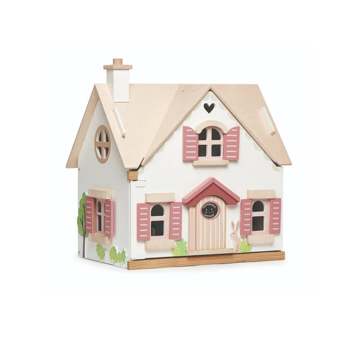 Encantadora casa de muñecas con un techo de madera natural, hermosas ventanas y espacio en el ático para hacer un dormitorio. El techo es removible para poder accesar fácilmente a toda la casa.