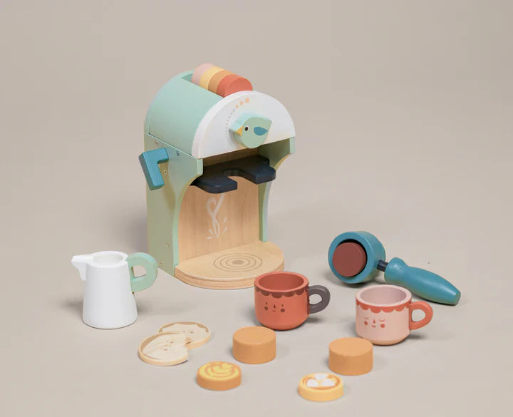 Disfruta de un delicioso cafecito con galletas utilizando nuestra maquina de café de madera. El botón del pajarito hace sonido al girarlo.