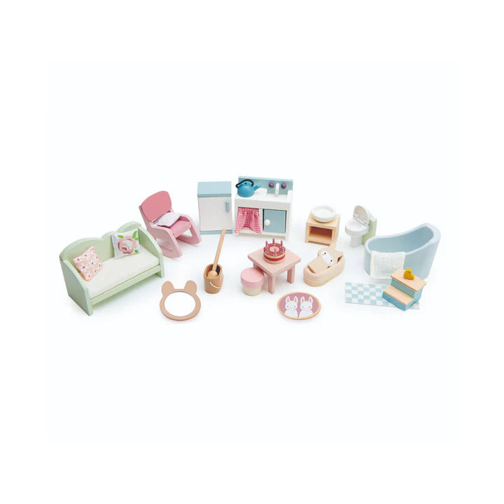 Este colorido y variado set de muebles combina un poco de todos los muebles que puedes encontrar en cualquier casita de muñecas. Incluye: un sillón, una mecedora, cuna y conejito bebé, espejo de conejo, cuadro de conejo, 3 almohadas, una mesa con taburete, un pastel de cumpleaños, tina de baño, toalla y tapete, escalones, pato de juguete, inodoro, lavabo, trapeador y balde, cocineta con tetera y un refrigerador.