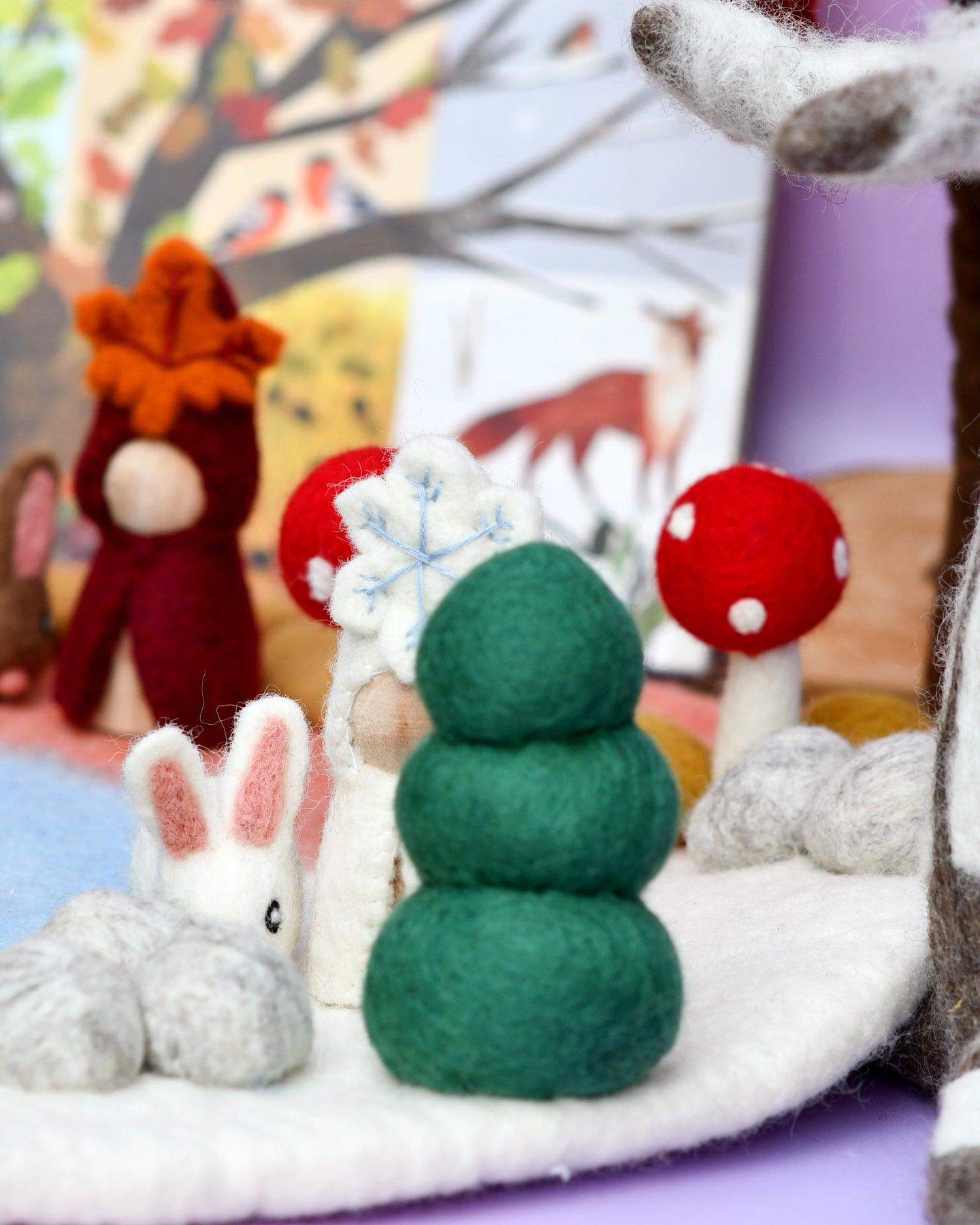 Invite a su hijo a un mundo de maravillas estacionales con este encantador paisaje de juegos de fieltro. Con un diámetro de 45 cm, esta alfombra de juego es ideal para jugar en la mesa y ofrece infinitas posibilidades para contar historias creativas. Además, cada tapete viene con su propia bolsa para el polvo para facilitar su almacenamiento y cuidado.