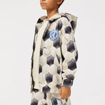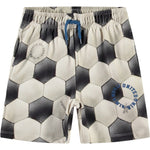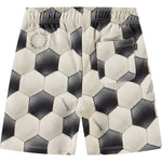Pantalones cortos deportivos de algodón orgánico. Tienen un corte regular, llegan hasta la rodilla y perneras anchas. Cuentan con cintura elástica con cordón interior, bolsillos laterales y un bolsillo trasero. Presentan un estampado de fútbol en blanco y negro con un estampado redondo de goma en relieve en una pernera con el texto «World United Win Win».