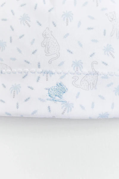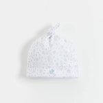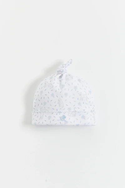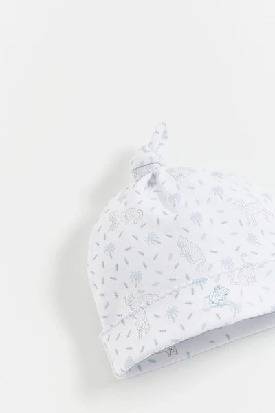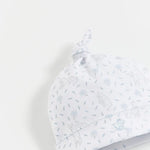 Gorro estampado de 100% algodón pima con logo bordado a tono con la estampa en el doblez. El nudo ajustable permite adaptarse al tamaño de cada bebé, mientras que su suavidad lo convierte en un complemento perfecto para añadir al ajuar.