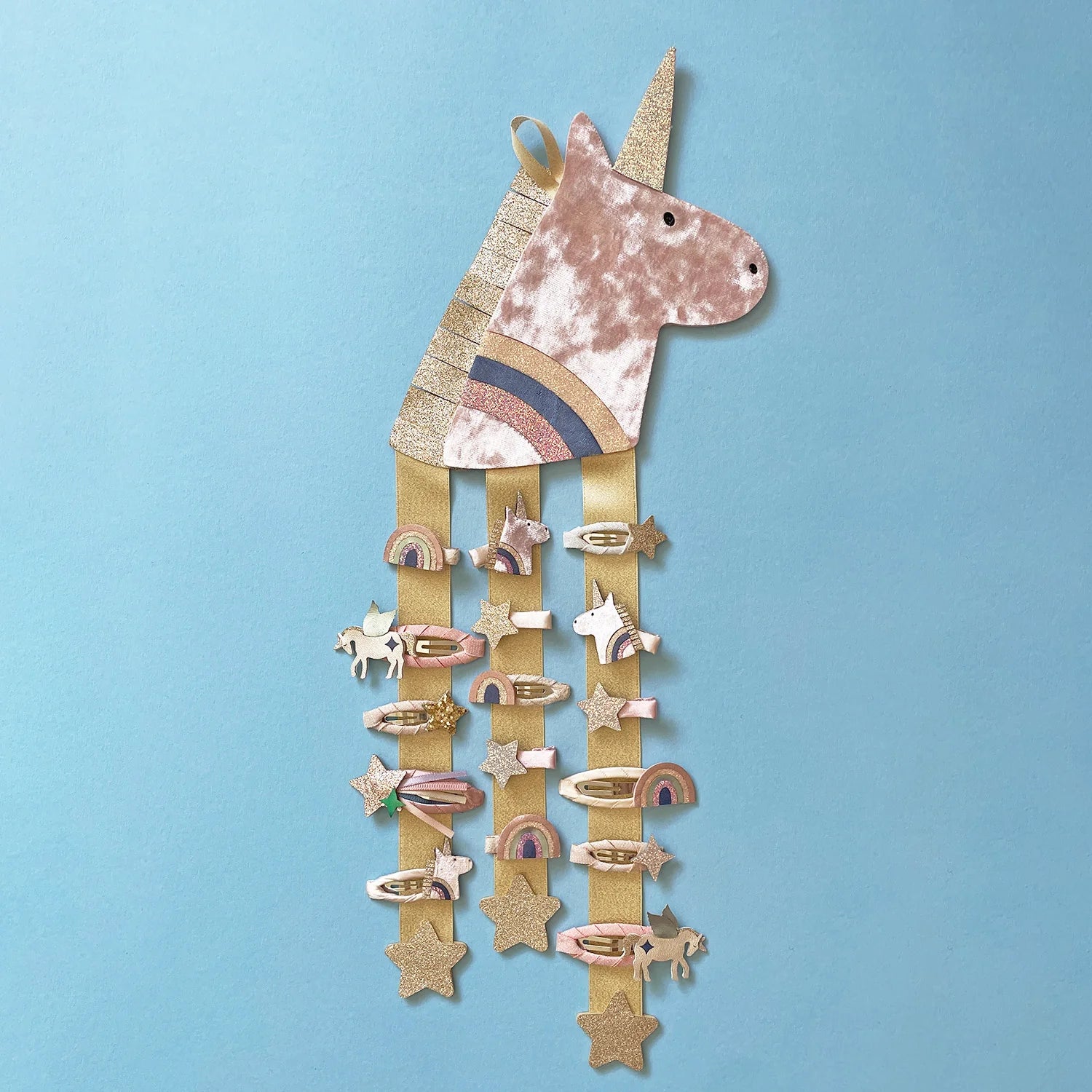 Unicornio elaborado con una combinación de terciopelo suave y telas brillantes con purpurina.