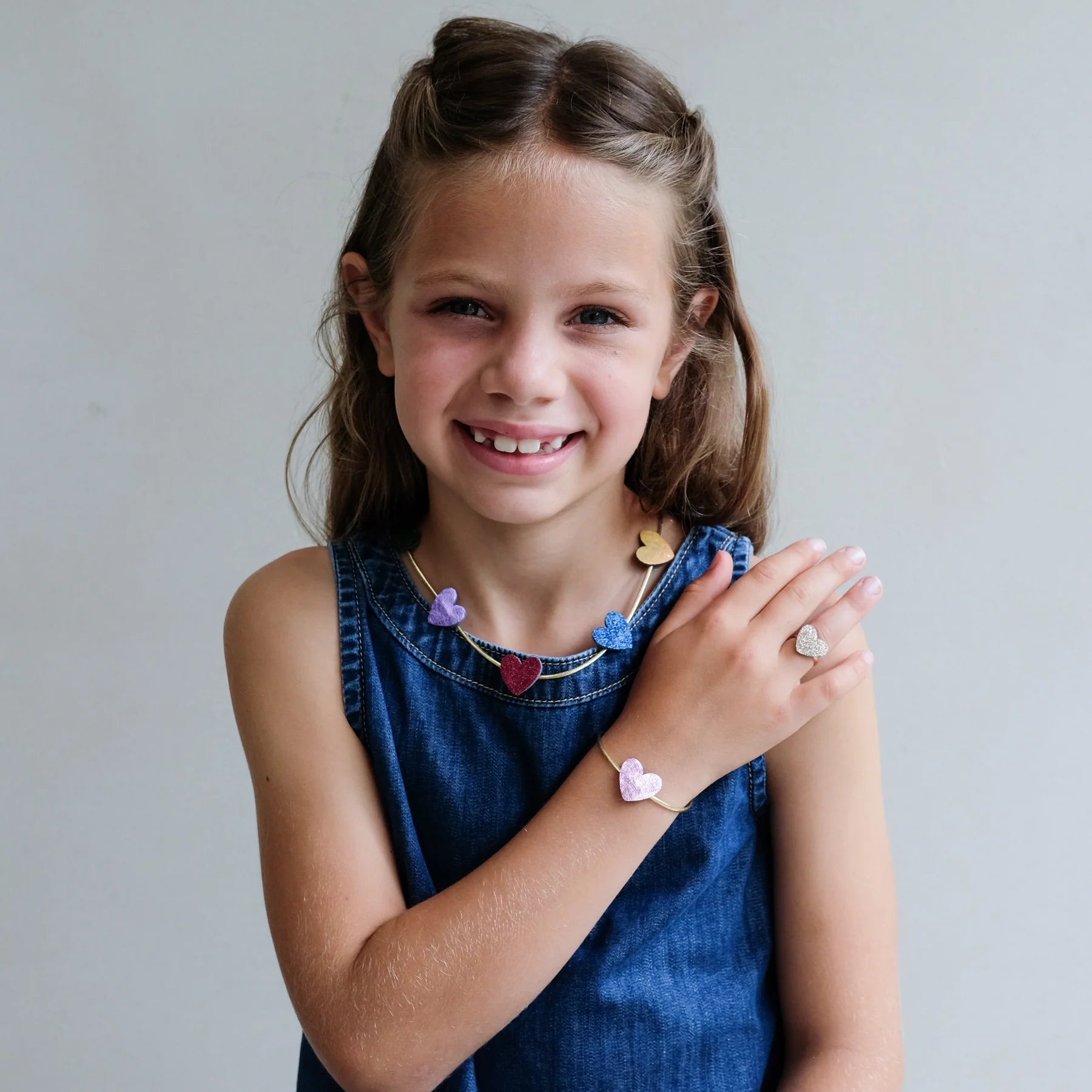 El conjunto incluye un collar, una pulsera y un anillo con corazones de tela elaborados con una mezcla de brillos y metalizados mates.