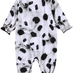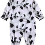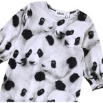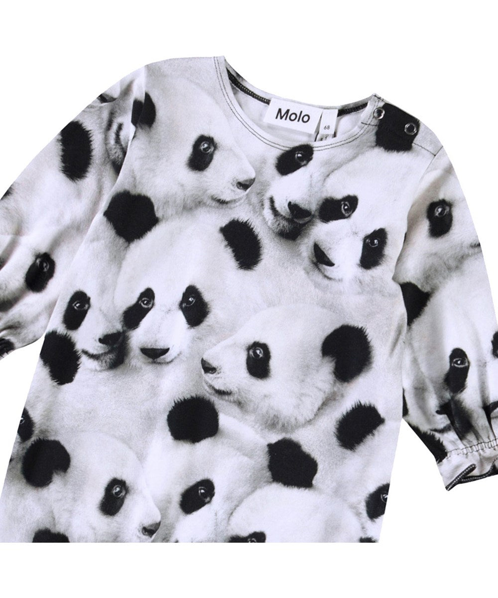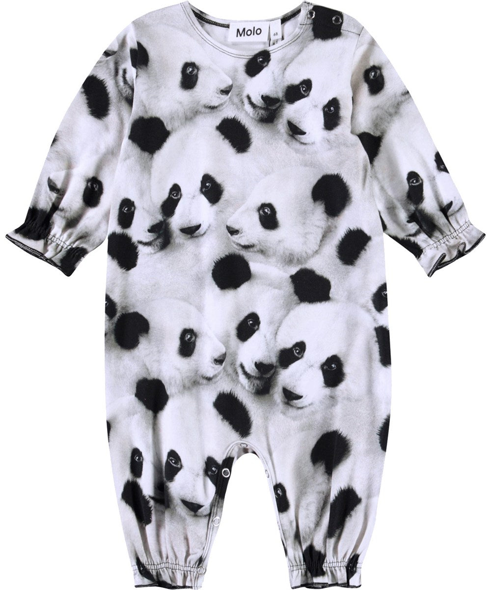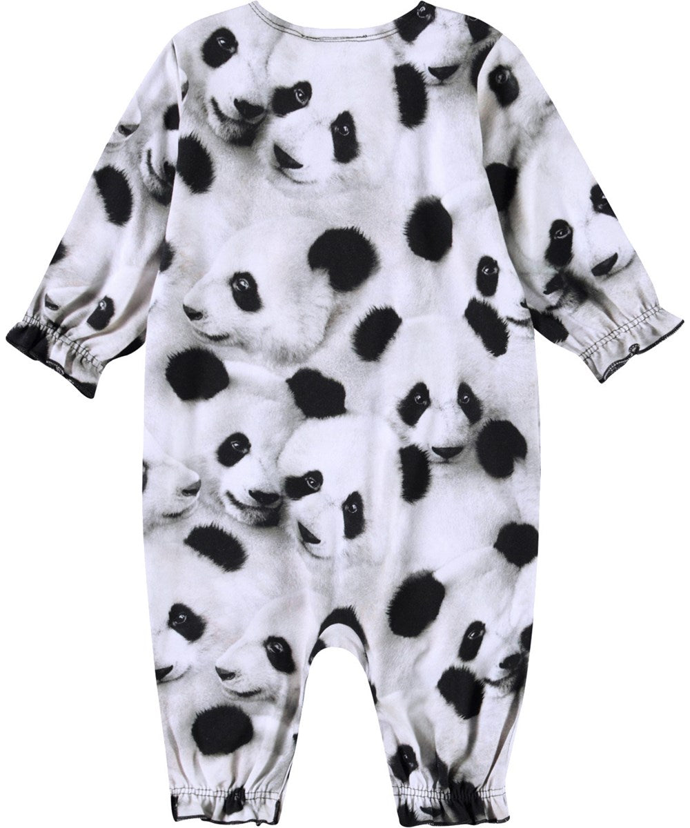 Mono para los más pequeños, confeccionado en algodón orgánico. El mono es holgado, con mangas y perneras largas. Tiene elástico en los puños y los tobillos, con un pequeño volante. El cierre de botones en un hombro y entre las piernas facilita su colocación y extracción. El mono luce un estampado integral de caras de panda.