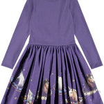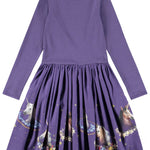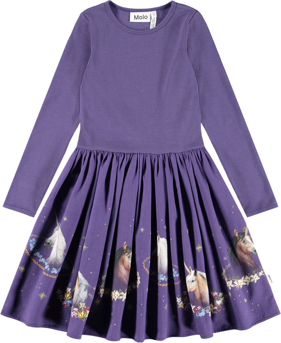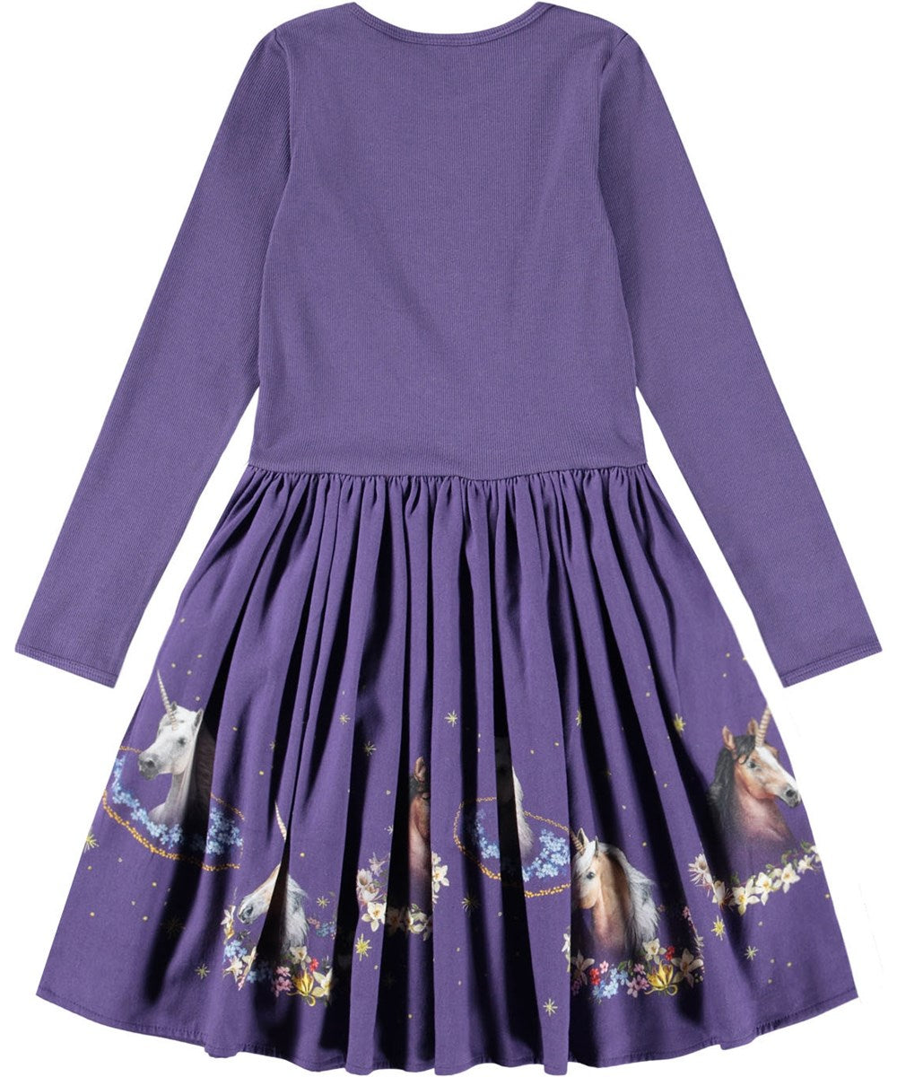 Vestido morado de manga larga confeccionado en algodón orgánico con parte superior ajustada de canalé, cuello redondo y falda voluminosa de corte circular confeccionada en franela de algodón. La falda tiene un estampado de unicornios y un cielo estrellado.
