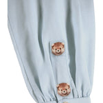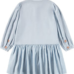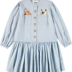 Bonito vestido azul claro de viscosa. El vestido tiene unos bonitos botones en la parte delantera, dos bolsillos y una falda circular incorporada, así como cierre de botones en las mangas. El vestido tiene un estampado de simpáticos animales junto a los botones y en los bolsillos.