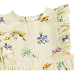 Body amarillo de manga larga para los más pequeños, confeccionado en algodón orgánico con estampado de animales. Cuenta con bonitos ribetes y botones a presión en los hombros y entre las piernas para facilitar el cambio de ropa.