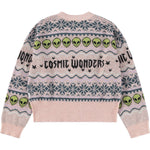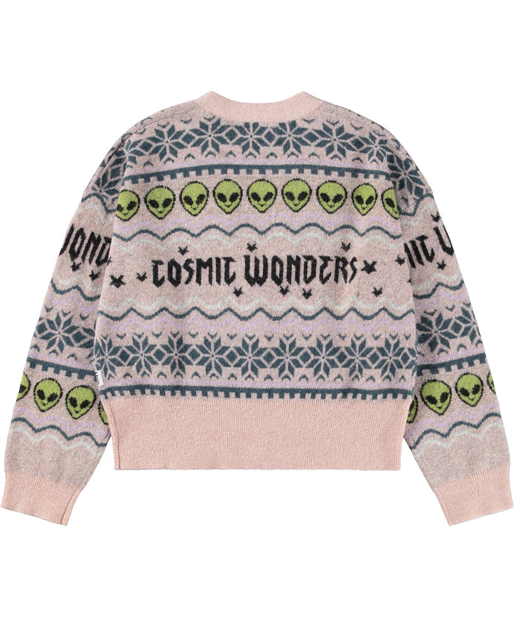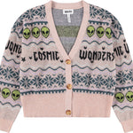 Precioso cárdigan multicolor confeccionado en una mezcla de lana y alpaca. Este cárdigan está tejido con un bonito diseño colorido, inspirado en la historia del tejido nórdico, con pequeños alienígenas y el texto «Cosmic Wonder». El cárdigan tiene cuello en V, puños acanalados y botones finos en la parte delantera.