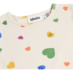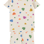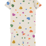 Pelele de color crema para los más pequeños, confeccionado en suave algodón orgánico con estampado de arcoíris. El pelele tiene botones en la parte delantera, mangas y perneras cortas, cuello pequeño y corte holgado. Cuenta con botones a presión entre las piernas, excepto en la talla 104.