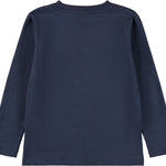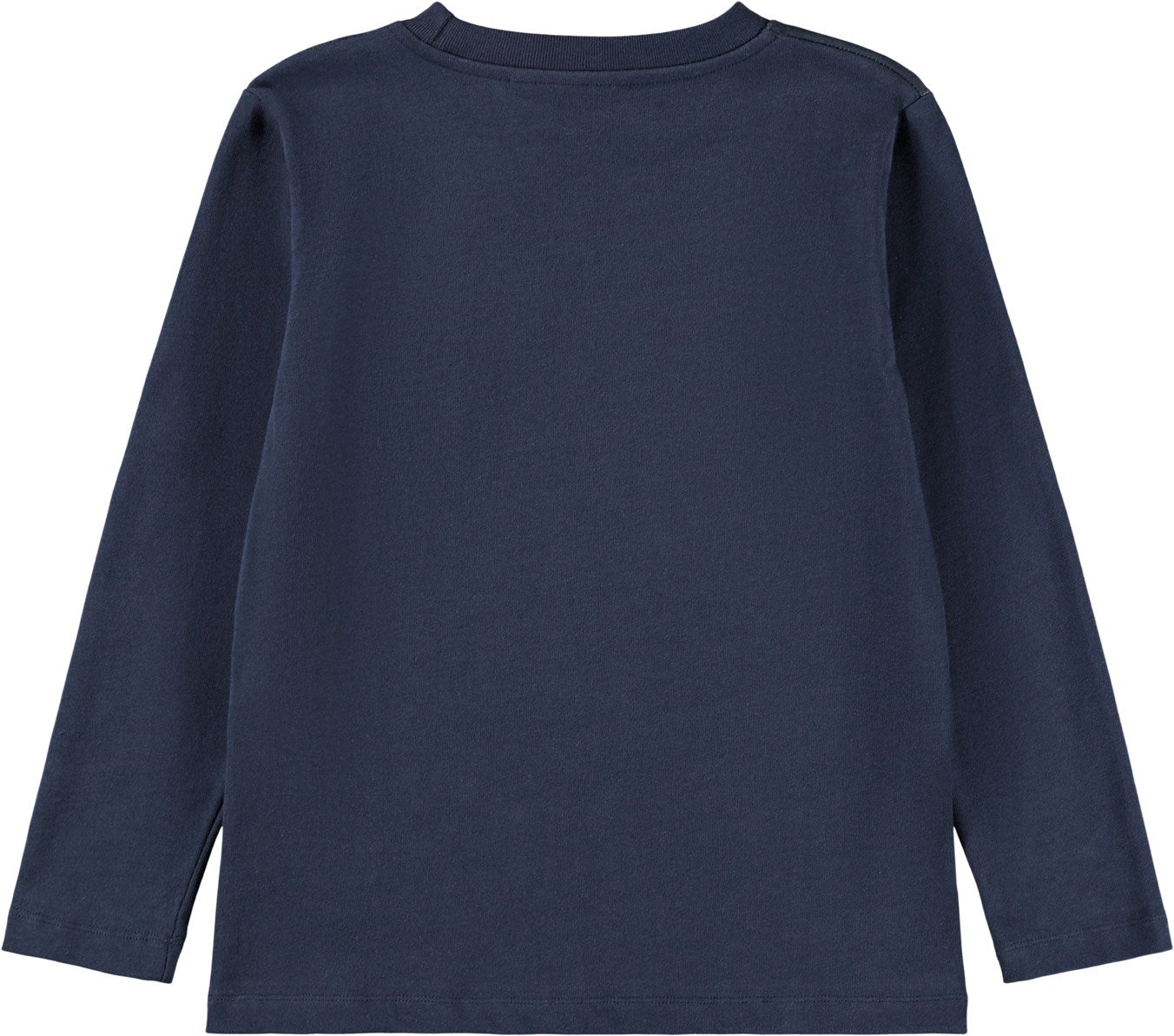 Camiseta azul oscuro de manga larga confeccionada en suave algodón orgánico con cuello acanalado. La camiseta de manga larga tiene un corte holgado y un estampado frontal de un tiranosaurio bajo un cielo lleno de estrellas.