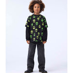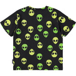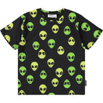 Camiseta negra confeccionada en suave algodón orgánico con mangas cortas y cuello acanalado. La camiseta tiene un corte holgado y un estampado de caras alienígenas en amarillo neón y verde.