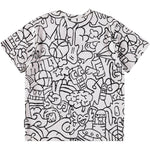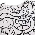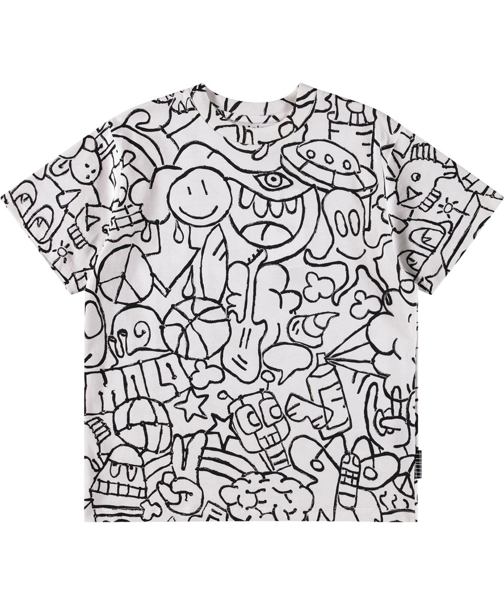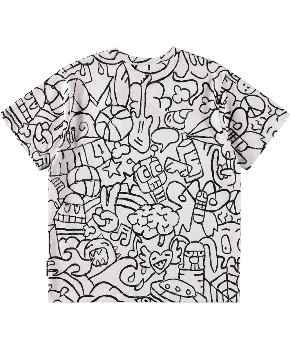 Camiseta blanca de algodón orgánico con mangas cortas y cuello acanalado. La camiseta tiene un corte holgado y un estampado artístico en negro.
