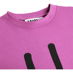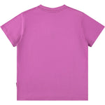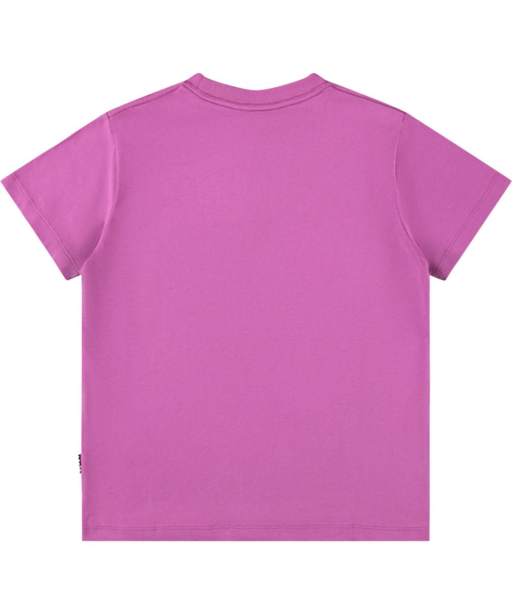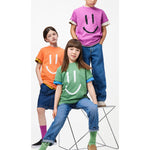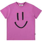 Camiseta morada confeccionada en suave algodón orgánico con mangas cortas y cuello acanalado. La camiseta tiene un corte holgado y lleva estampada una cara sonriente.