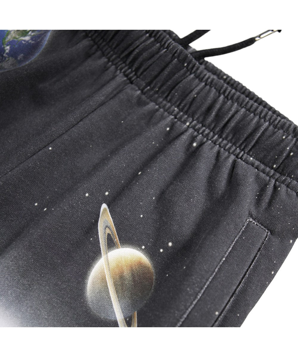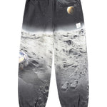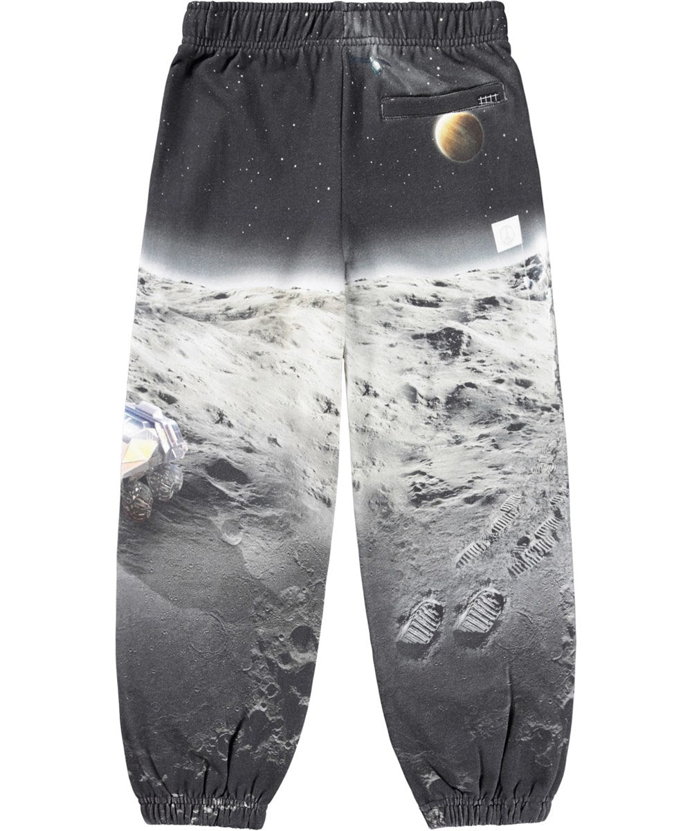 Pantalones de chándal multicolores confeccionados en algodón orgánico con cintura elástica ajustable, bolsillos laterales, un sencillo bolsillo trasero y elástico alrededor de los tobillos. Los pantalones de chándal tienen un corte recto y un bonito estampado de la luna y los planetas.