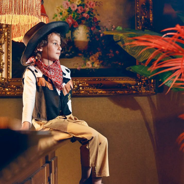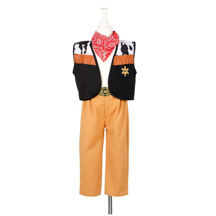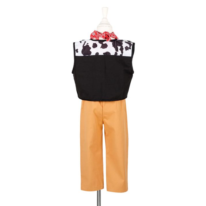 ¡Yeehaw! ¡El vaquero Chuck entra en el salón local con su resistente traje de vaquero! Es el vaquero más temido de la ciudad... ¡Con su fiel caballo, atrapará a todos los malos! El traje de vaquero está fabricado con un 90 % de algodón y un 10 % de poliéster. La longitud de los pantalones es de 56 cm (3-4 años), 68 cm (5-7 años).