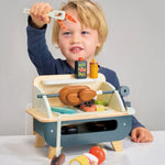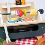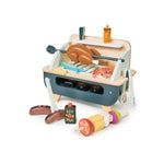 Un asador de madera autoportante con parrilla desmontable, incluye un montón de accesorios divertidos, como: 3 brasas brillantes, un pollo rotisero de 5 partes, 2 salchichas y un tenedor, una brocheta de madera con 5 piezas de verduras para ensartar, 2 camarones, pescado, una rodaja de limón, botes de salsa barbecue y mostaza, pinzas y un cuchillo de mentira. Las piezas son fáciles de guardar debajo de la parrilla después de jugar.Perfecto para juegos de simulación.
