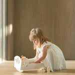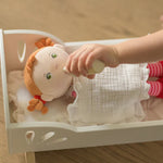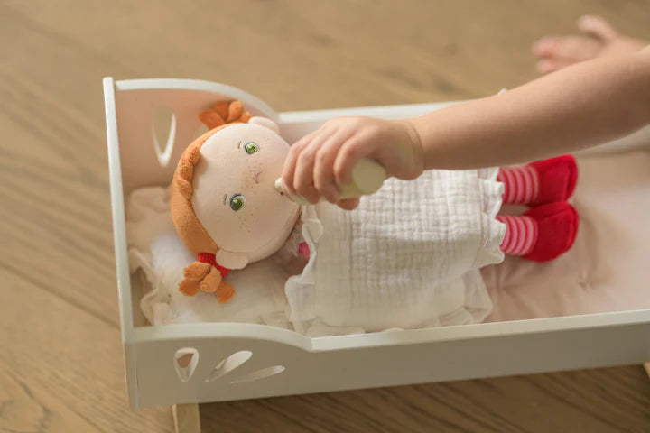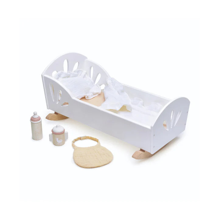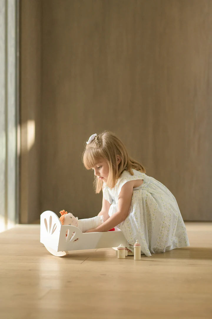 Duerme a tu muñeca en esta preciosa cuna de madera natural pintada en color blanco con hermosos detalles recortados. Tu muñeca u osito de peluche seguro tendrá dulces sueños después de que le cantes una canción de cuna mientras lo meces. La cuna incluye: un colchón de color rosa palo, una colcha de muselina blanca y una almohada. Para prolongar el tiempo de juego, hemos incluido un biberón de madera, una taza para bebé y un babero de muselina.