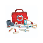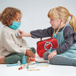 Un maletín médico de tela y madera con estilo retro, lleno de todos los elementos esenciales para tratar a pacientes enfermos. El set incluye: un estetoscopio, tijeras, otoscopio, una jeringa, un martillo para la rodilla, un monitor de presión arterial, un cubrebocas de tela, curitas, calcomanías que muestran dolencias y remedios, un portapapeles, un termómetro, un palo plano, una botella de pastillas y un tubo de pomada. Ideal para el juego de roles.