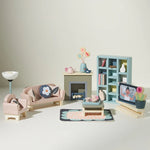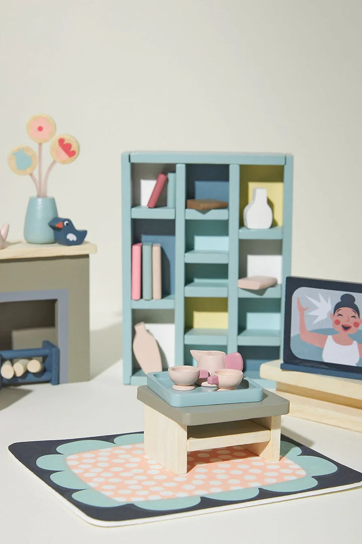 Amarás jugar y descubrir todos los elementos que tiene esta acogedora sala de muñecas. Este set con una paleta de colores hermosos y mucha atención al detalle incluye: