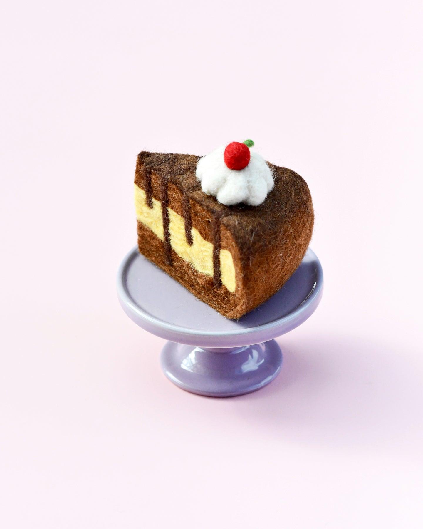 Saborea la magia del juego de simulación con nuestra rebanada de pastel de chocolate y caramelo de fieltro. Cubierto con una cereza, este pastel de fieltro es una delicia decadente que seguramente inspirará sonrisas.