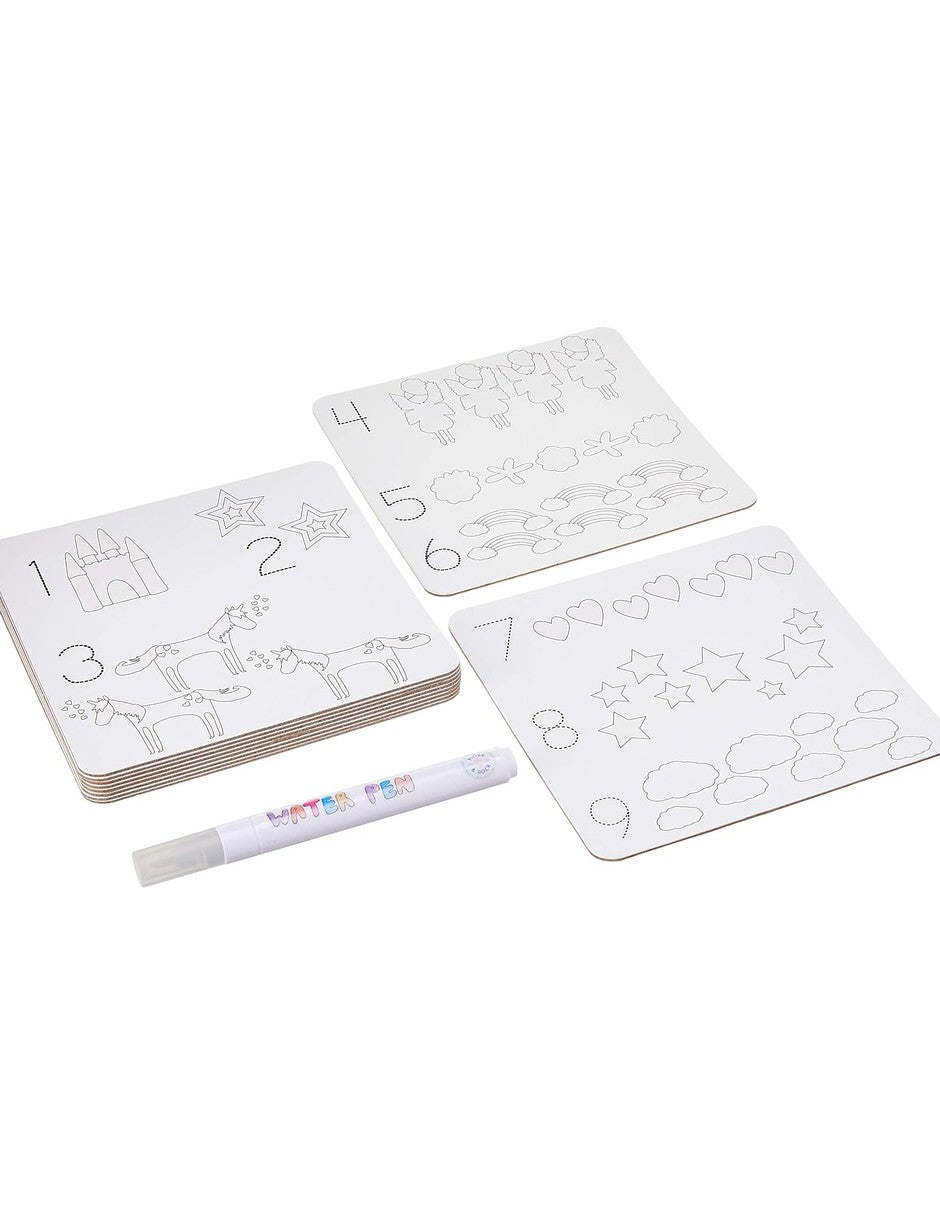 No más preocupaciones sobre las marcas de punta de fieltro en las paredes con estas fantásticas tarjetas de agua de “cambio de color”. El kit contiene 10 tarjetas reutilizables y una pluma de agua. Simplemente llene la pluma con agua y juega. Cada tarjeta tiene palabras, números o escenas para colorear. ¡También fomenta el aprendizaje a través de la diversión!