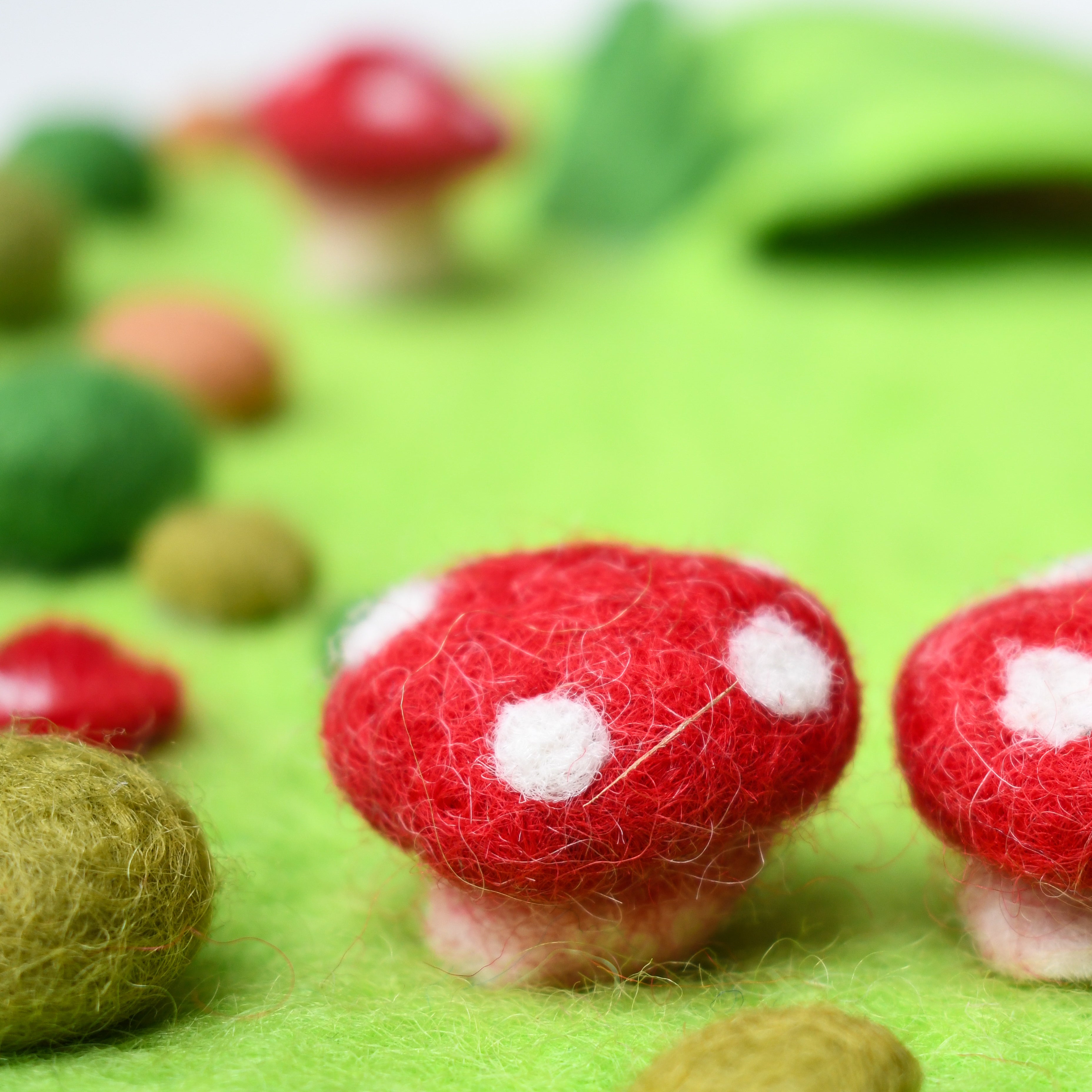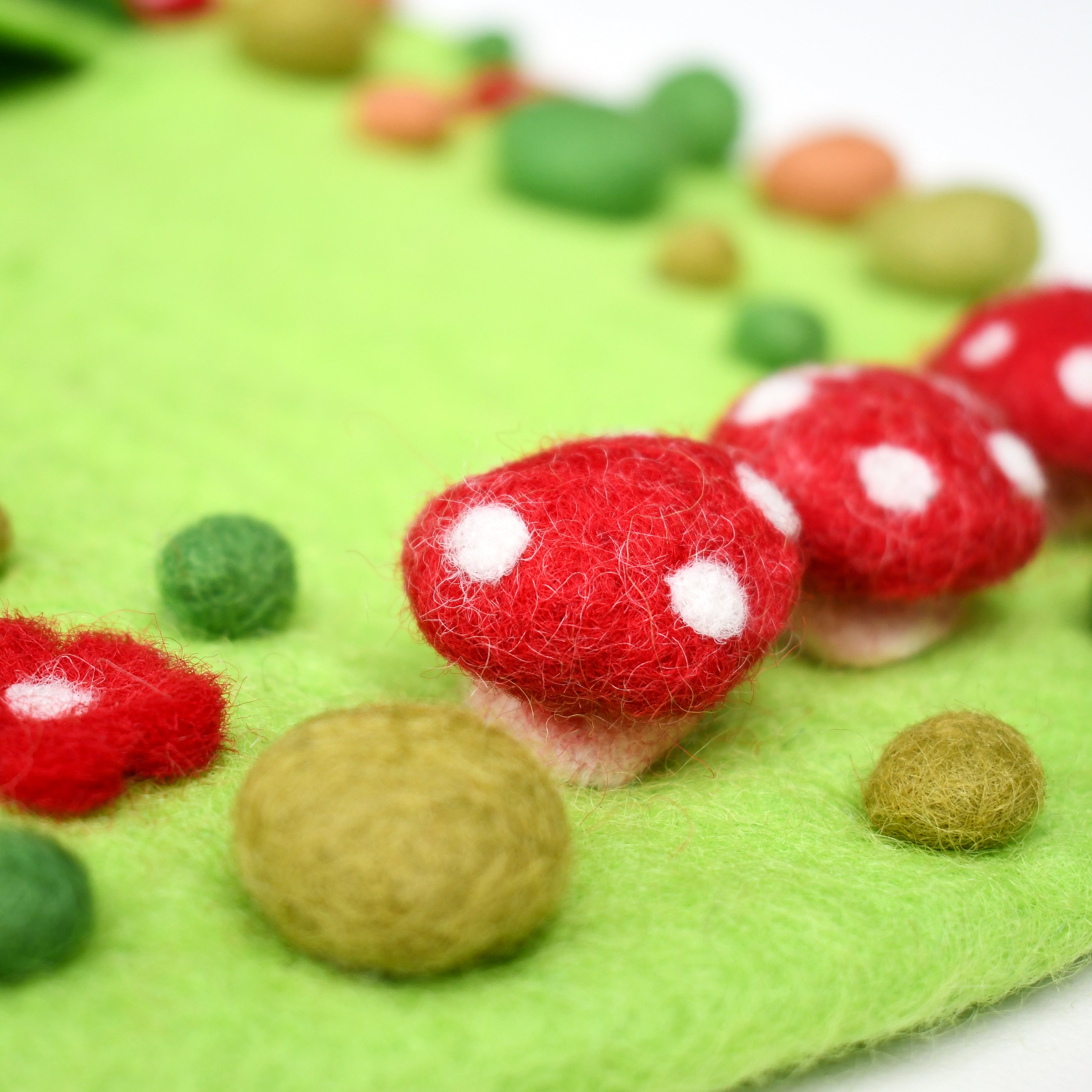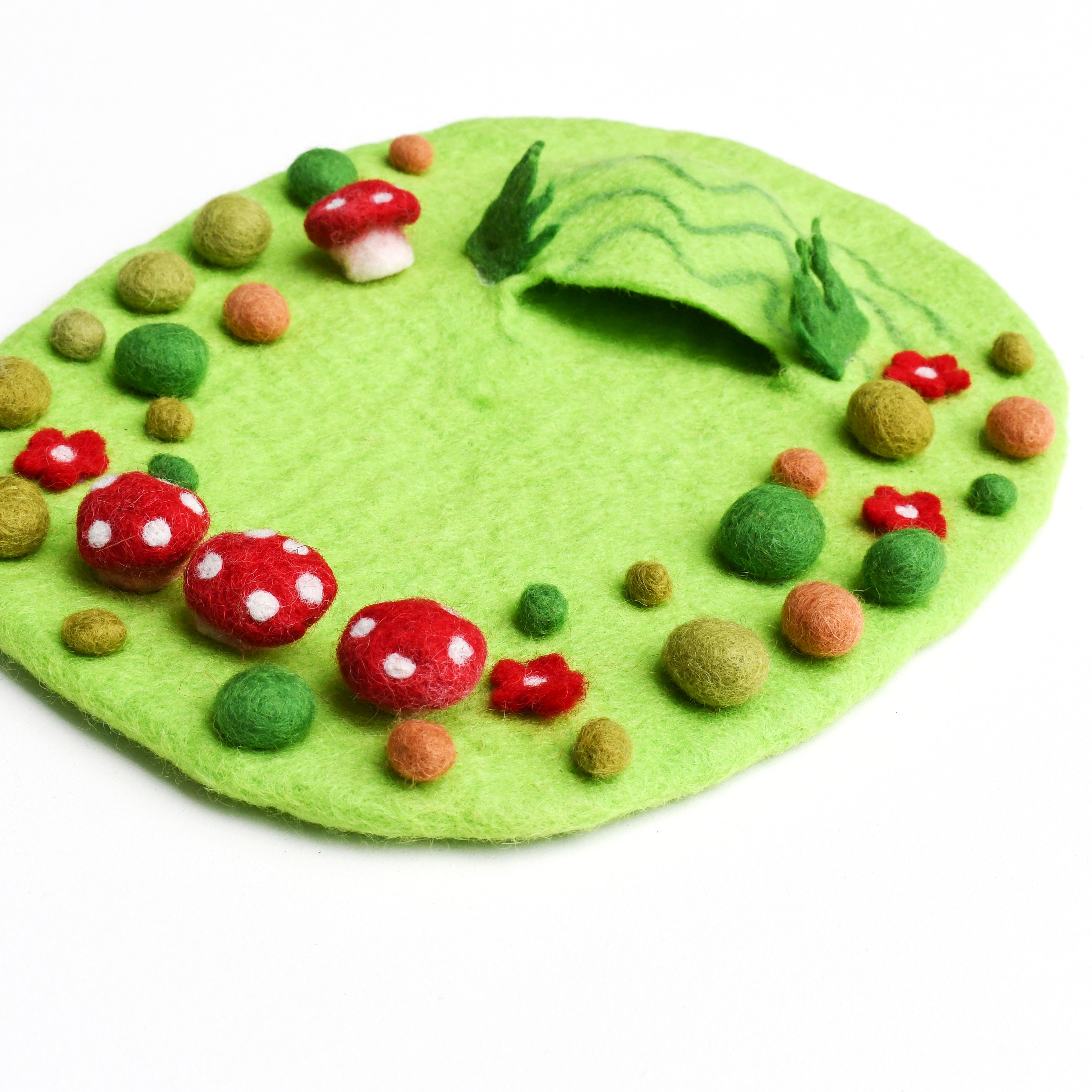 La leyenda dice que las hadas aparecen cuando hay un anillo de hongos venenosos. Nuestro Fairy Toadstool Garden está hecho de fieltro de lana y presenta pequeños hongos, rocas de colores y una pequeña cueva para que los personajes se escondan.
