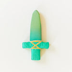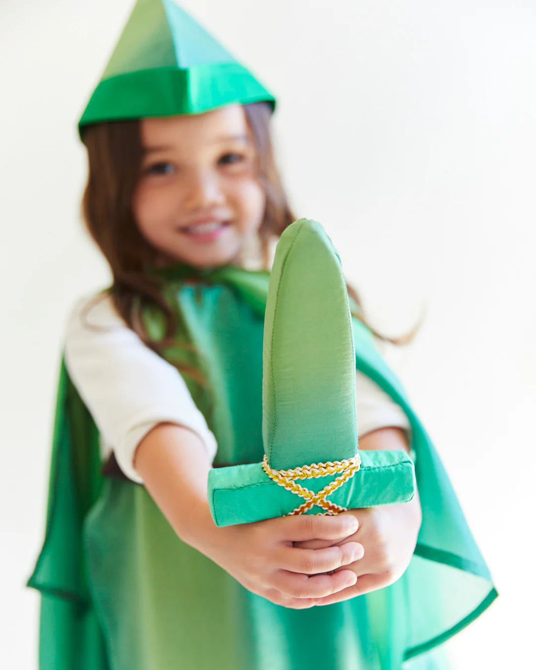 Las dagas suaves miden 8,5 pulgadas de largo y están hechas de espuma suave pero rígida. Están cubiertas con nuestra seda con patrón jacquard para su mango y seda verde bosque para su "hoja". Combinan perfectamente con nuestro  sombrero Peter Pan  y túnica Peter Pan.