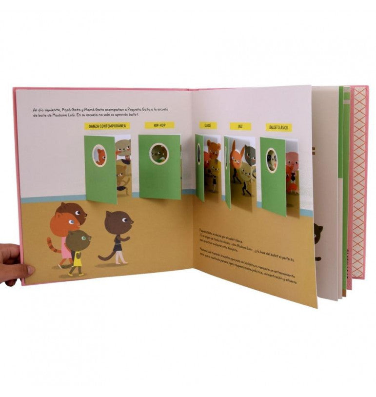 Ayuda a Pequeña Gata a cumplir su sueño: ¡ser bailarina! Un libro interactivo con solapas, bailarines, músicos y… ¡un gran escenario pop-up para el festival de fin de curso!