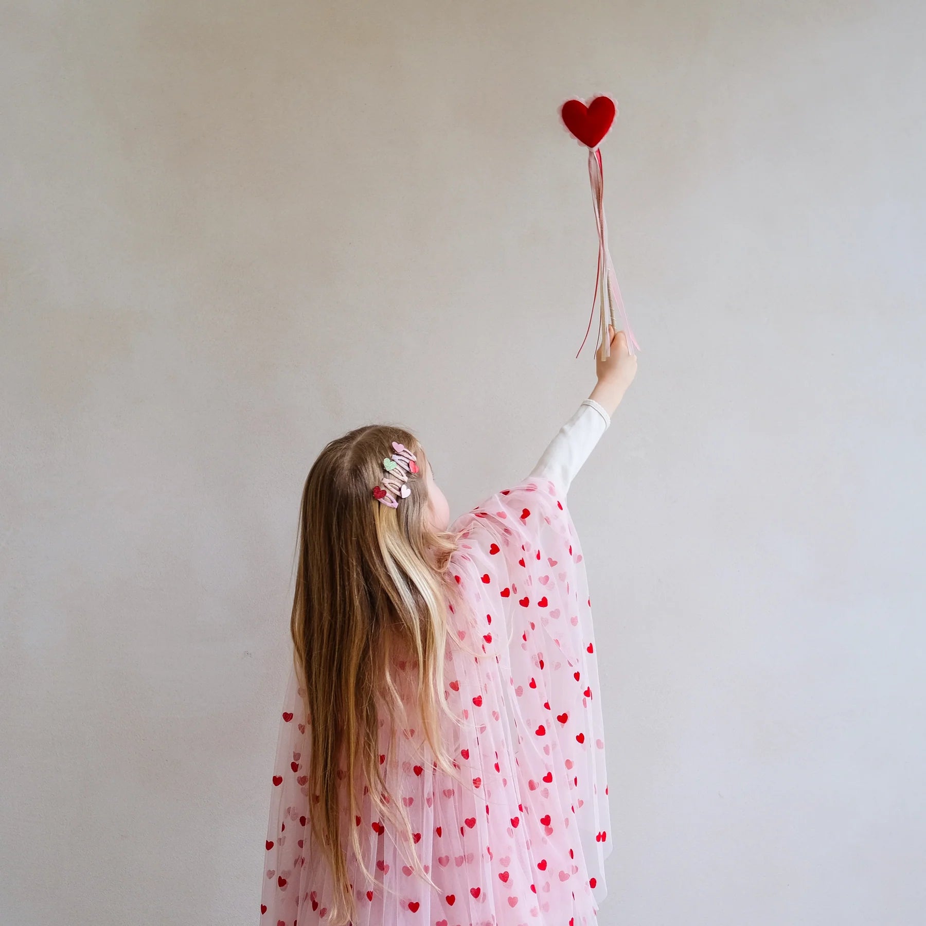 ¡Reparte mucho amor con un solo movimiento de la preciosa varita con corazón de terciopelo de Mimi y Lula! Con sus suaves bordes festoneados y sus cintas de raso, esta varita conquistará sus corazones. ¡Combínala con nuestro tutú o capa con estampado de corazones para completar el look!