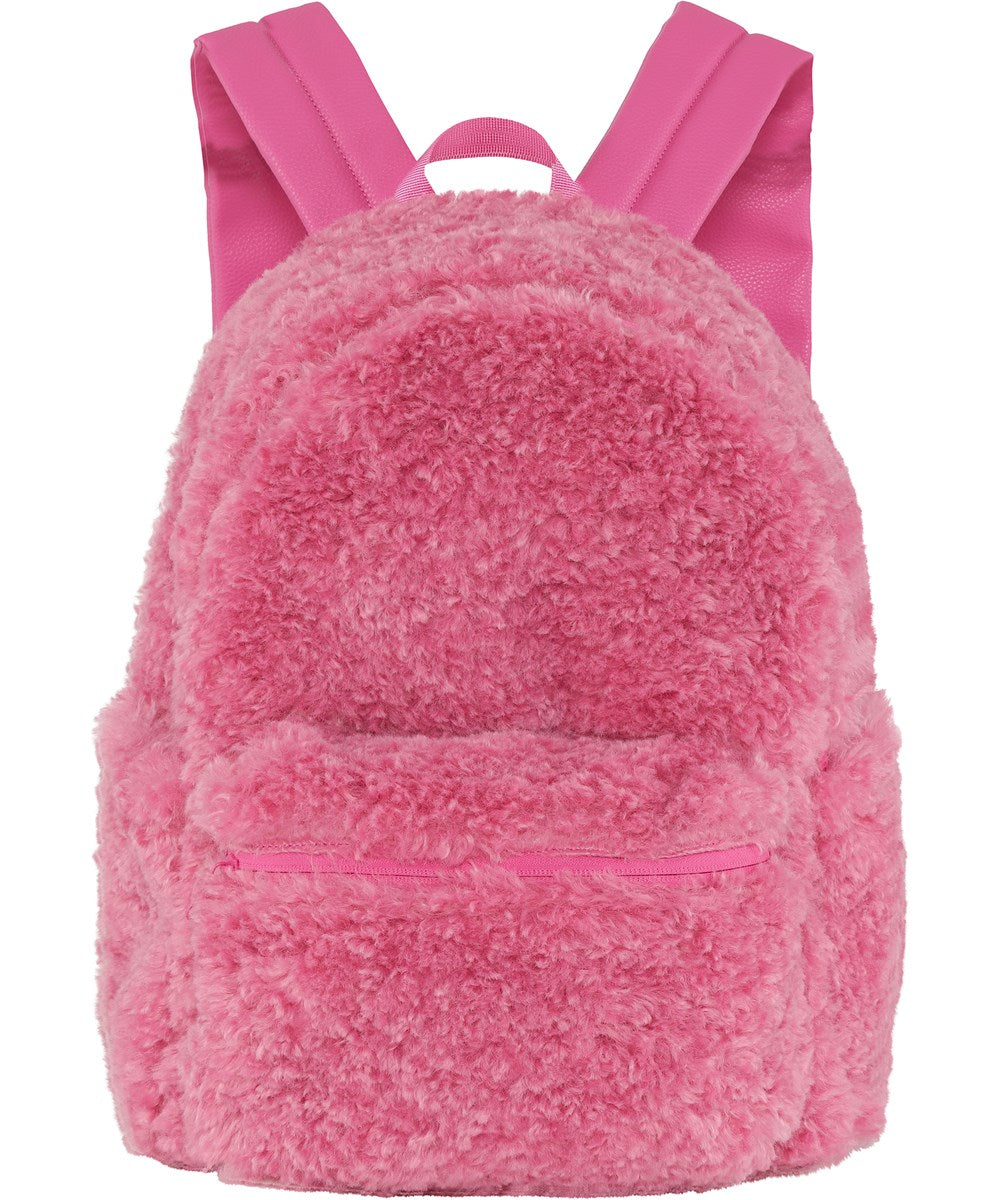 Mochila rosa de piel sintética suave. La mochila tiene mucho espacio para libros, carpetas, estuche para lápices, lonchera y una funda acolchada que puede adaptarse a una computadora portátil o tableta. Tiene un bolsillo frontal con cremallera para un fácil acceso, bolsillos para botellas en ambos lados, espalda y correas de hombro acolchadas y una correa de pecho ajustable que ayuda a distribuir el peso de manera uniforme.