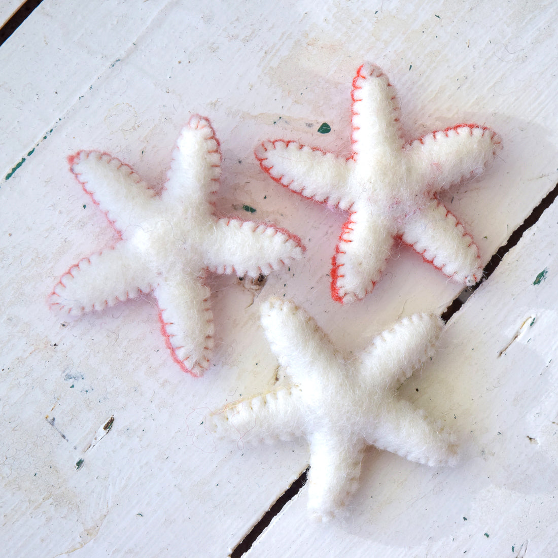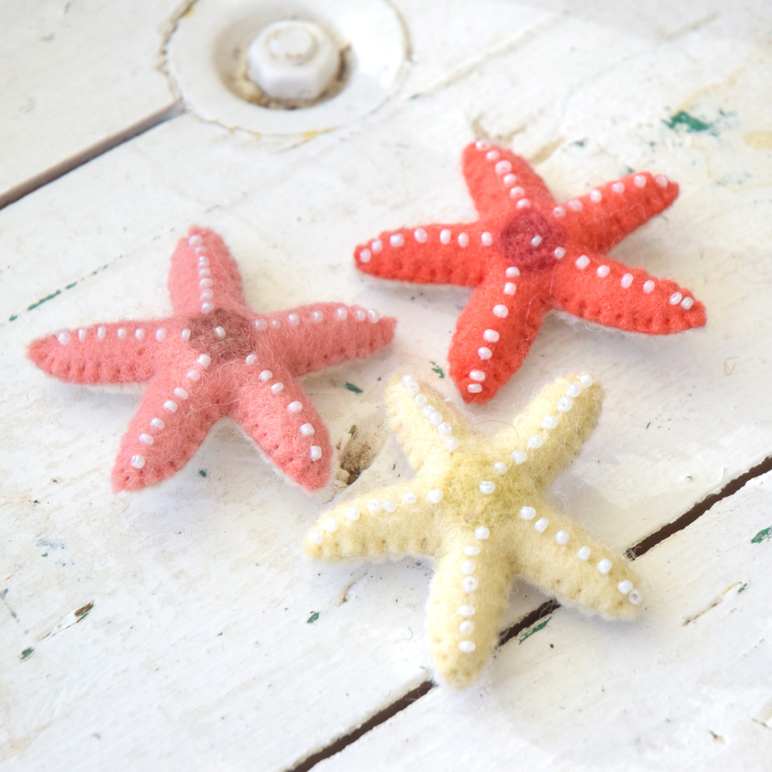 3 estrellas de mar bellamente hechas a mano. Ideal para juegos de mundo pequeño, este juego de estrellas de mar se sumará al juego imaginativo.