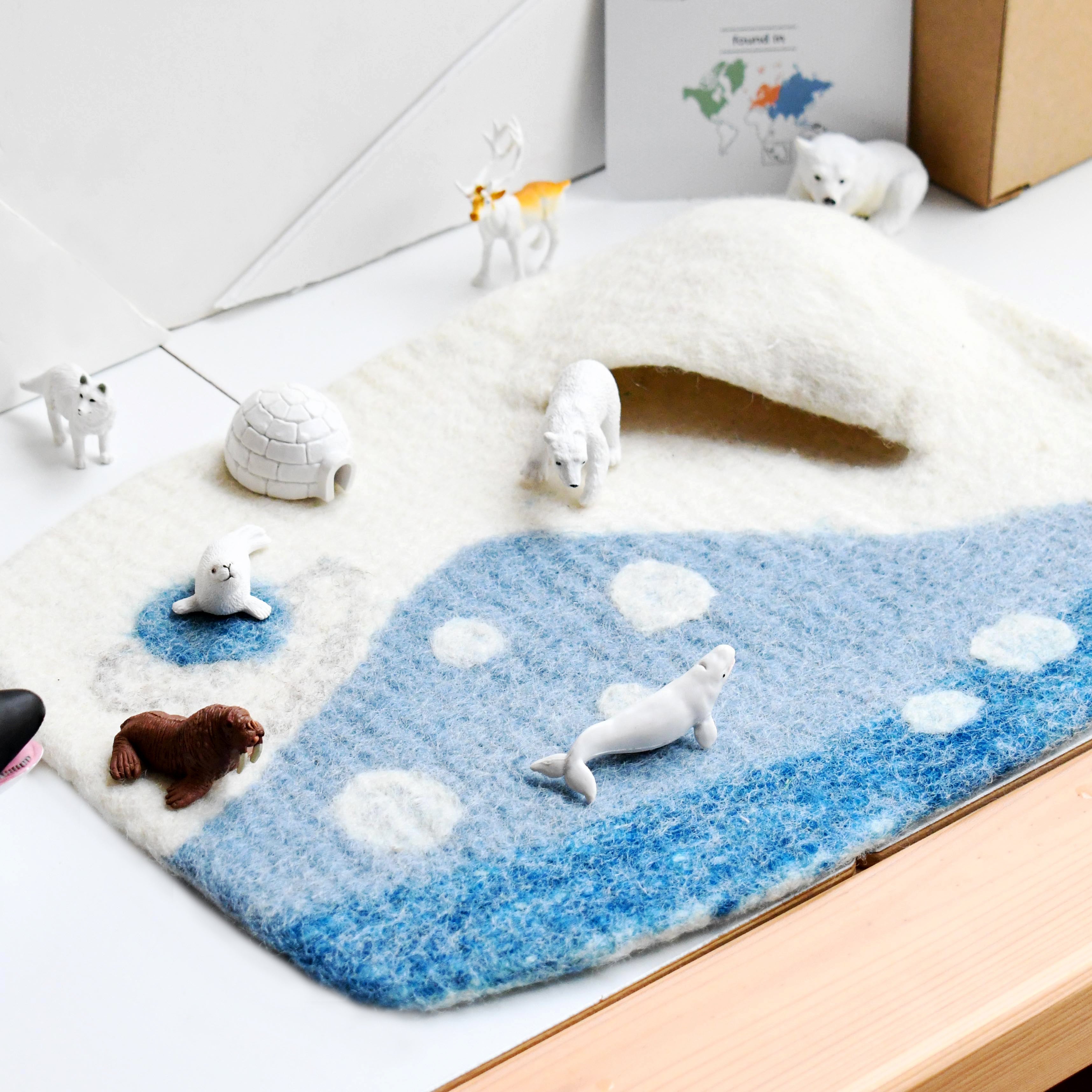 ¡Nuestro paisaje del Ártico presenta la orilla del mar cubierta de hielo, témpanos marinos para que sus animales caminen y una cueva para que sus animales se escondan! Este es un gran telón de fondo nevado para que la imaginación de sus pequeños florezca a través del juego del mundo pequeño.
