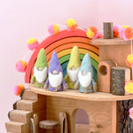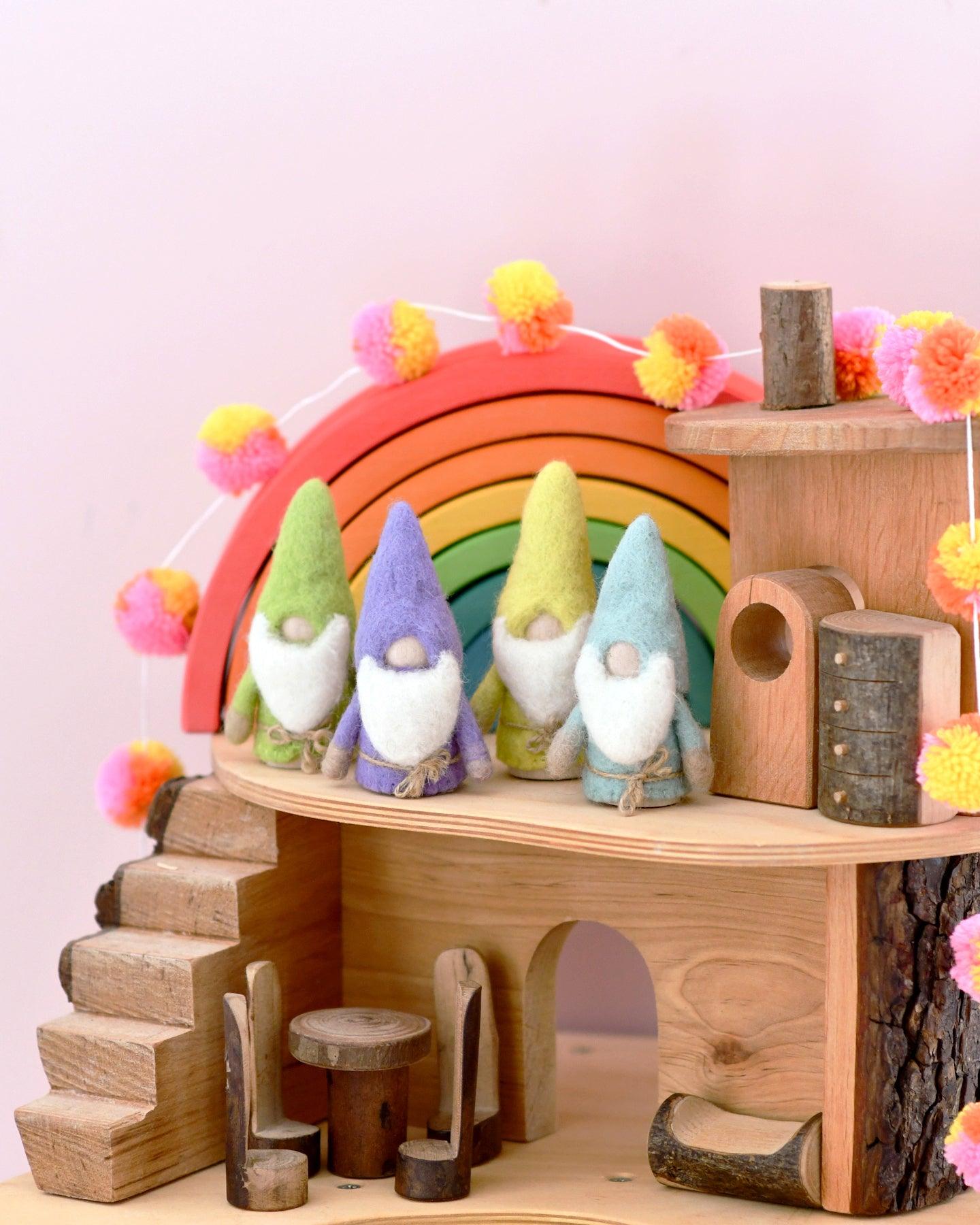 Hecho a mano con materiales ecológicos: madera de abedul plateada y trajes de fieltro de lana. Su textura suave y sus encantadores detalles hacen que sea un placer sostenerlos y jugar con ellos, inspirando la exploración sensorial y el aprendizaje táctil.