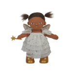 Viene vestida con un vestido de tul brillante extraíble con alas fijas de terciopelo bordadas, una varita brillante con forma de estrella,
