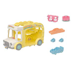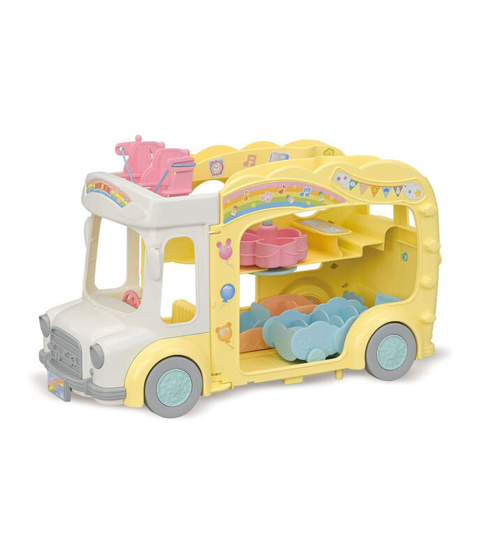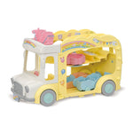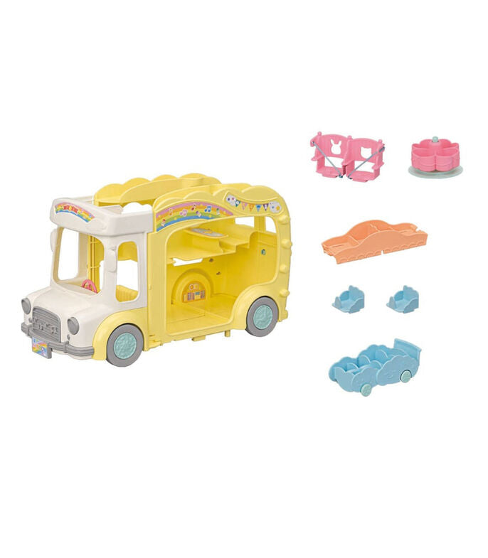Sylvanian Families Autobús de Arcoíris; ¡La aventura de aprender, comienza al salir de casa! En el Autobús del arcoíris, los bebés de la Aldea Sylvanian comienzan el día todos juntos. La ruta pasa por todas las casas de la Aldea Sylvanian y se suben los más pequeños: bebés, gemelos ¡y hasta los trillizos! ¡Que nadie se olvide del cinturón!