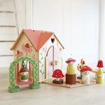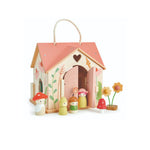 La cabaña del bosque más linda y adorable que hayas visto. Con un techo de color rosa con asa para transporte, dos niveles y bellas puertas delanteras que se abren. El panel trasero es removible para convertirse en un jardín, en el cual se pueden colocar un bonito columpio, 2 flores y un hongo.