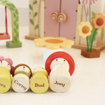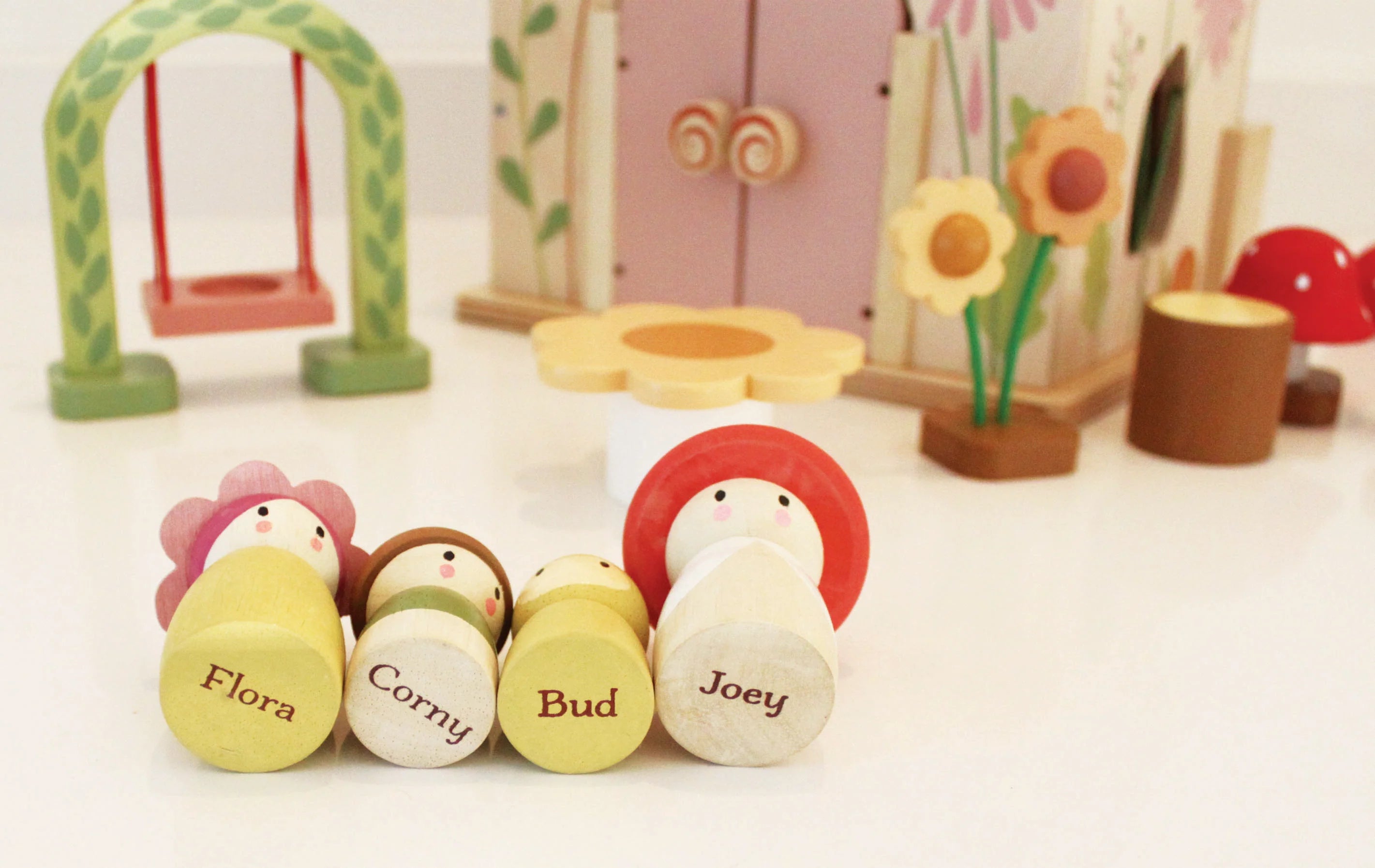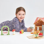 Hemos incluido una estufa de leña, una mesa de flor, 2 taburetes de botones, una lámpara de seta y una mesa de tronco. Acomoda al niño en su cama de tela o empuja a la niña en el columpio mientras mamá y papá observan las estrellas pasar. Disfruta creando historias en el bosque encantado.