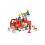 Este brillante camión rojo de bomberos cuenta con una manguera desenrollable y un brazo extensible de madera natural para llevar a los 4 valientes bomberos a grandes alturas para combatir incendios o rescatar a un gatito.