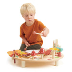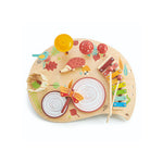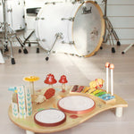 Nuestra mesa musical es un juguete educativo y divertido, diseñado para estimular la creatividad y el desarrollo sensorial de los niños. Fabricado con madera durable y pintura no tóxica, este set incluye dos tambores en forma de tronco, un xilófono de colores, un platillo amarillo, un silbato en forma de pájaro, dos campanas en forma de setas, una mariposa de clic-clac, un carillón de madera y dos baquetas de madera.