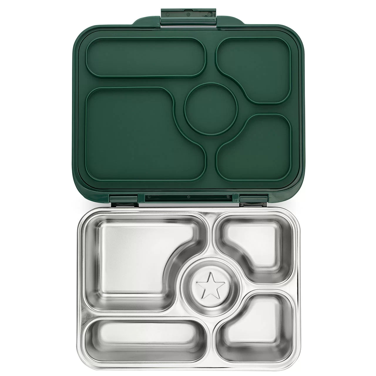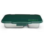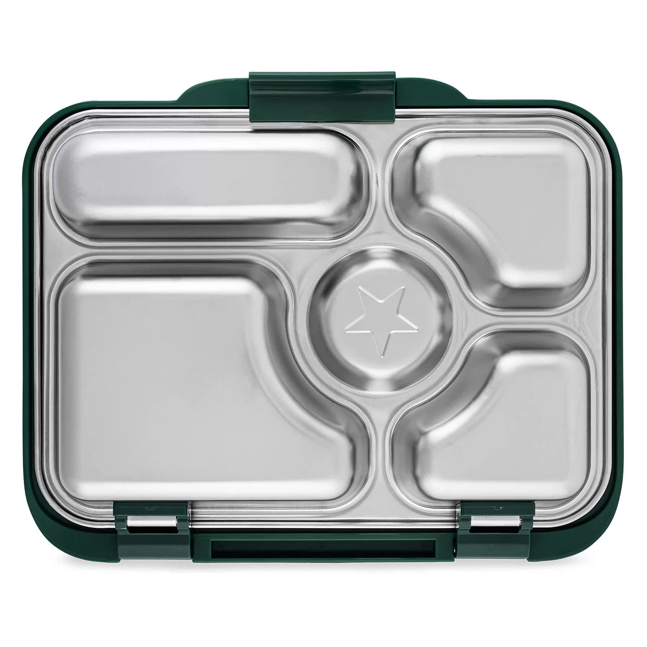 Yumbox Presto está fabricado con acero inoxidable y silicona de alta calidad. Su tapa forrada de silicona moldeada se engancha con la bandeja, lo que hace que Yumbox sea a prueba de fugas por dentro y por fuera (Para alimentos sólidos, húmedos y cremosos, no al agua, sopas o caldos). Empaca aderezos junto a las galletas sin preocupaciones. Para obtener el mejor sellado, no empaques en exceso.