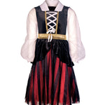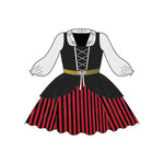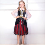 ¡Zarpá hacia la aventura con nuestro vestido Pirate Princess, la combinación definitiva de elegancia y audacia! Este look majestuoso y rebelde cuenta con una falda de tul a rayas negras y rojas para un estilo atrevido digno de una pirata. El corpiño de terciopelo negro es lujoso y feroz, y se completa con un cinturón dorado y una espectacular capa peplum que añade un toque de estilo real. El detalle de cordones en la parte delantera captura la esencia de una auténtica espadachina, mientras que las mangas Juliette de tul blanco vaporoso aportan un toque suave y caprichoso. Disponible en cuatro tallas, incluida la talla L (9-10 años), este vestido es perfecto para las pequeñas aventureras listas para dominar los mares con estilo.