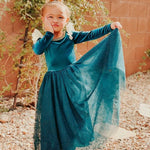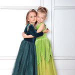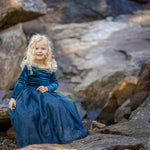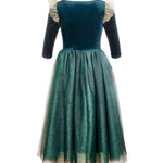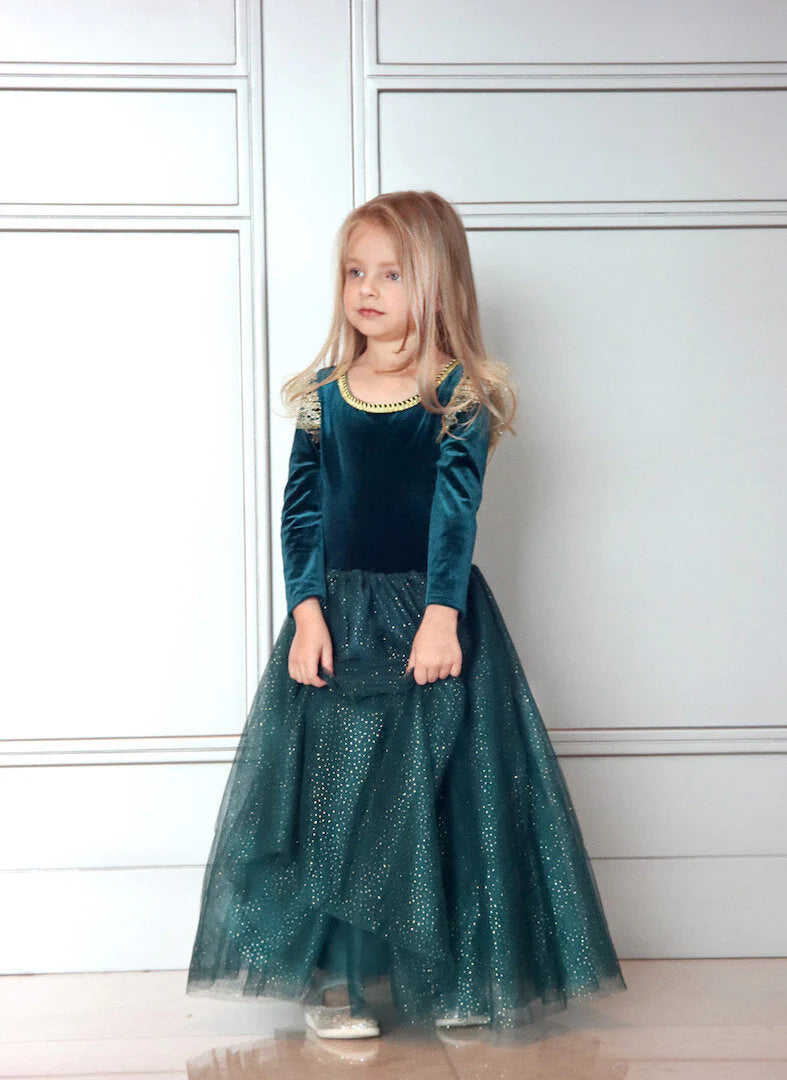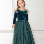 Representando a la primera princesa independiente que tuvo su propio final feliz, está nuestra querida Princesa Valiente y el vestido que hicimos en su honor le hace justicia. Siguiendo el diseño original de manga larga, elegimos un terciopelo verde azulado intenso súper suave y elástico, con un ribete dorado alrededor del escote y mangas onduladas de tul dorado en la parte superior de los hombros. La falda está confeccionada con varias capas de tul suave y brillante, a juego con el tono verde azulado del resto del vestido. Este es un vestido increíble y cómodo que queda perfecto como disfraz o como vestido de fiesta para tu pequeño.