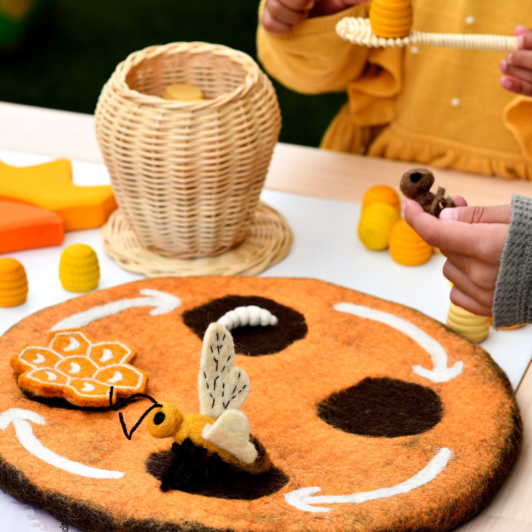 Estos hermosos juguetes del ciclo de vida de una abeja han sido hechos con fieltro y son ideales para juegos de mundo pequeño.