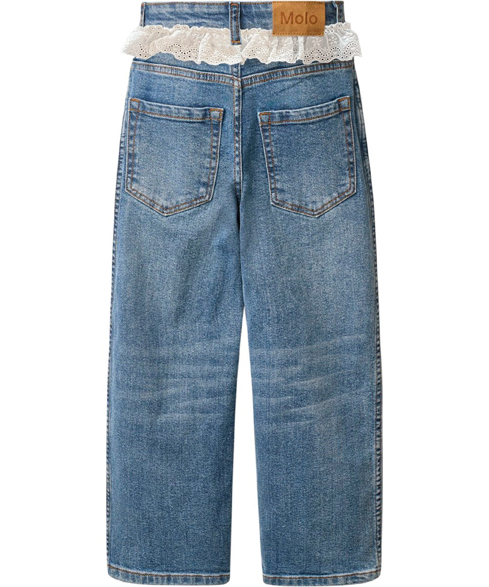 Vaqueros azules confeccionados en denim de algodón orgánico con detalles de encaje blanco. Los vaqueros tienen 5 bolsillos, pernera recta, cremallera y corte holgado con elástico ajustable en la cintura. Las tallas más pequeñas (92-134) tienen un botón a presión, mientras que las tallas 140-176 tienen un botón clásico de vaqueros.