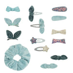 El calcetín contiene 14 accesorios, incluido un coletero de terciopelo y 13 pinzas para el cabello diferentes en una variedad de verdes suaves y brillos brillantes.