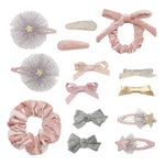 El calcetín contiene 14 accesorios, entre los que se incluyen dos gomas de terciopelo y 12 pinzas para el pelo diferentes en una gama de tonos rosa suave, gris, brillante y metalizado.