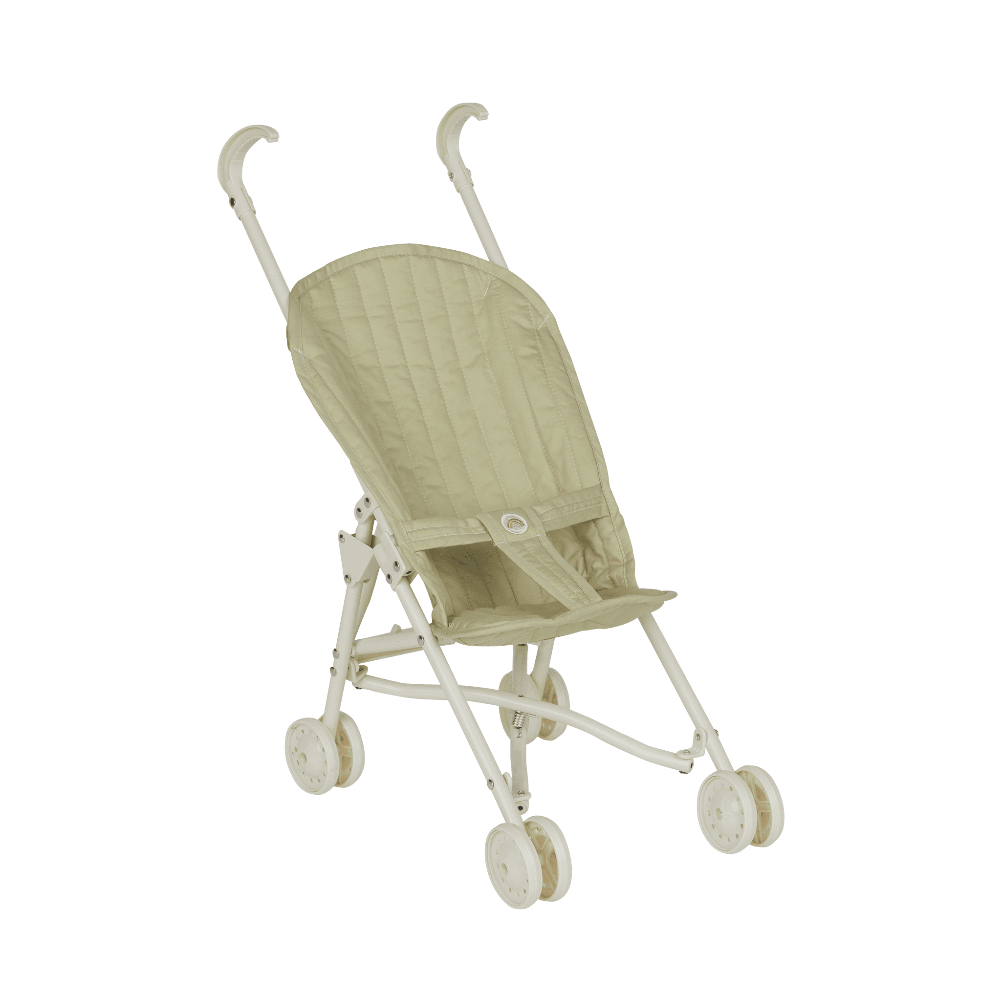 • El cochecito Sollie incluye un asiento de algodón acolchado sujeto a un marco de metal plegable, todo convenientemente guardado en una elegante bolsa de lona de algodón con cordón para facilitar su transporte.